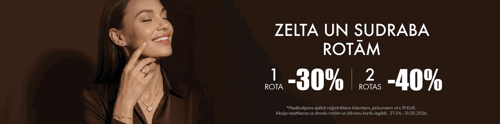 Akcija neattiecas uz zīmolu rotām un dāvanu karšu iegādi. 27.04.-31.05.26.